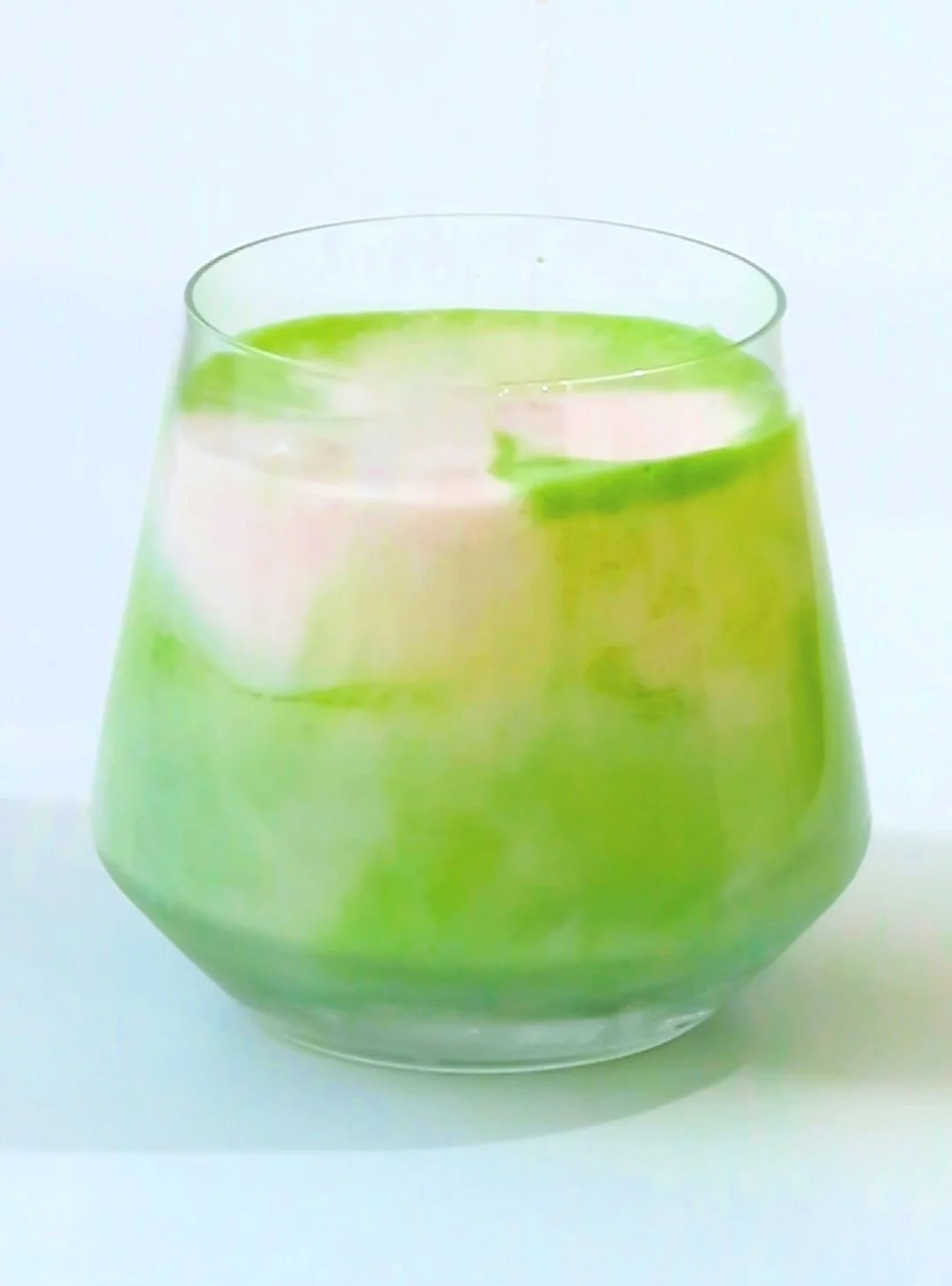 This iced matcha latte is mixed with strawberry milk cream to create a refreshing, sweet and creamy matcha fruit drink with a beautiful swirling pattern of pink and green :)