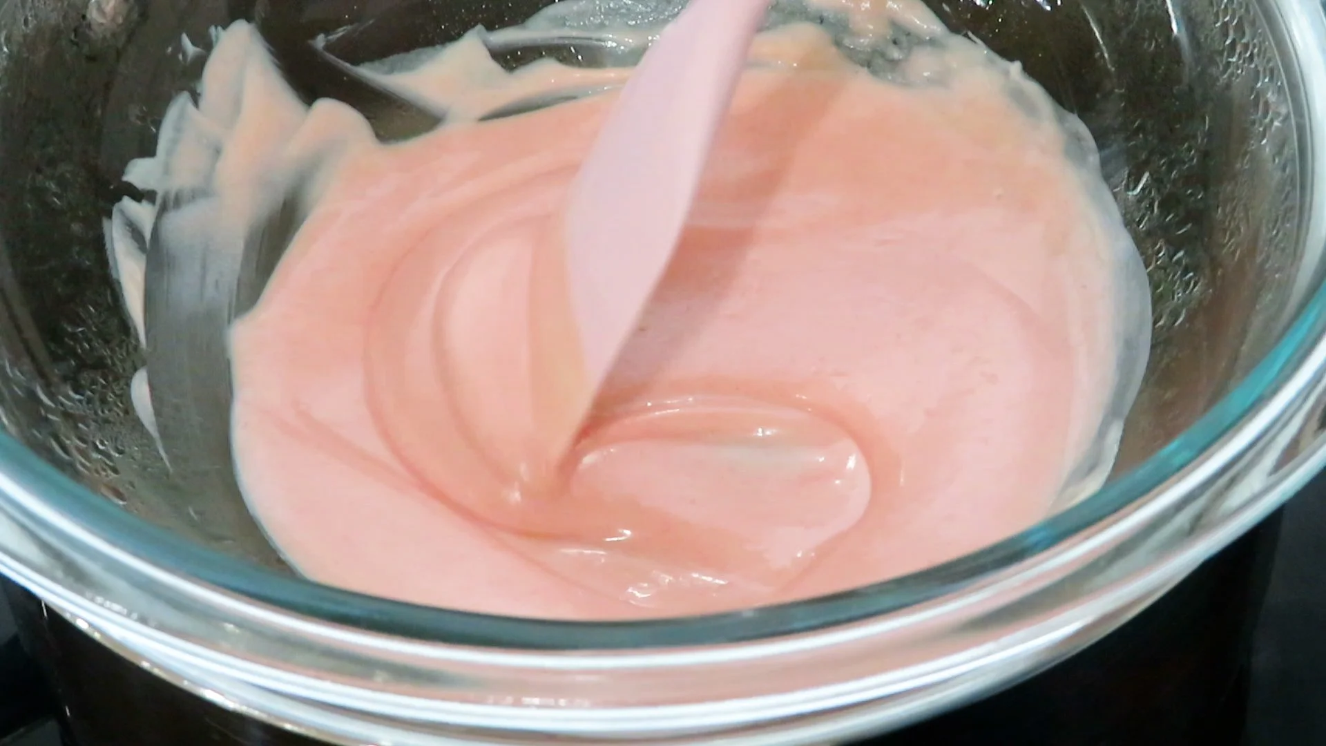 Once the chocolate has melted, add oil-based pink food colouring or add oil-based red food colouring, a little bit at a time, mixing to incorporate until the desired shade of pink is achieved.