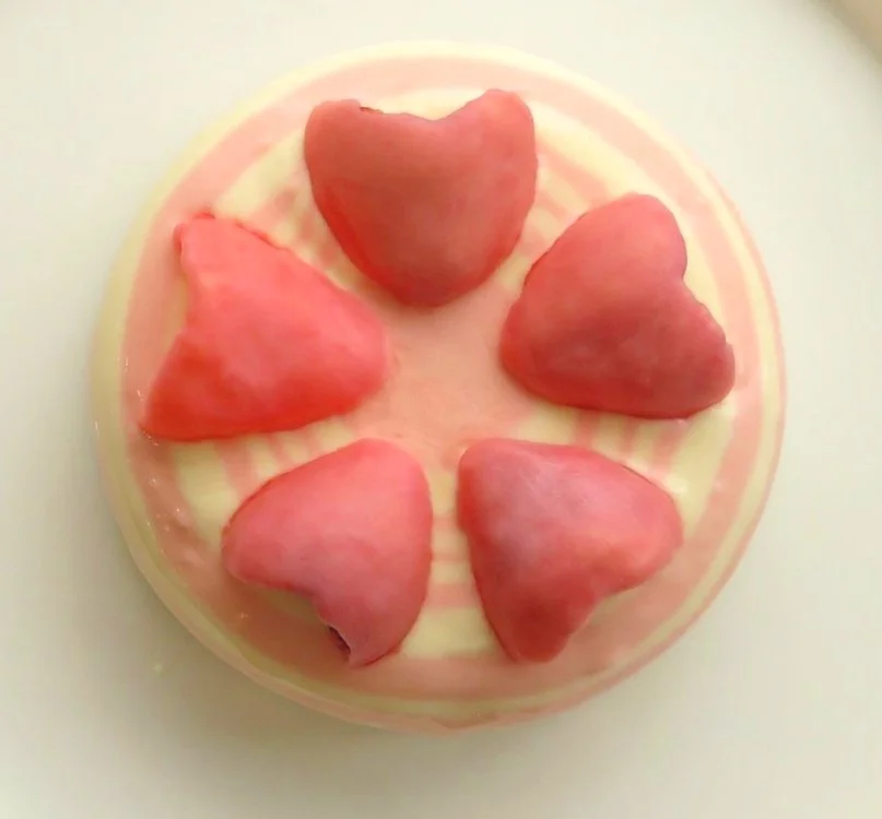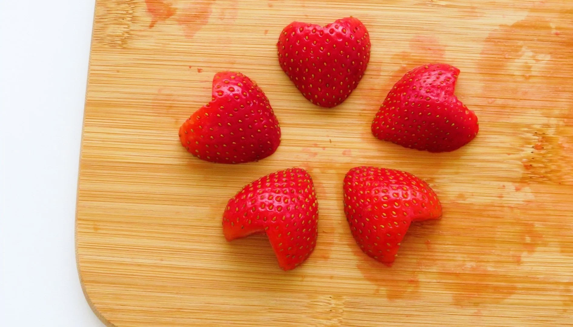 I cut the tops off the strawberries, slice them in half and then slice a triangle out of the top of each strawberry half (see video) to create a petal shape. When 5 of these “petals” are arranged together, they give the shape and appearance of a cherry blossom! You could stop here and simply use the strawberries as a garnish, but if you want to go all out and complete the effect, dip the strawberries into pink or white chocolate and you will have a beautiful pink cherry blossom decoration for your cheesecake!