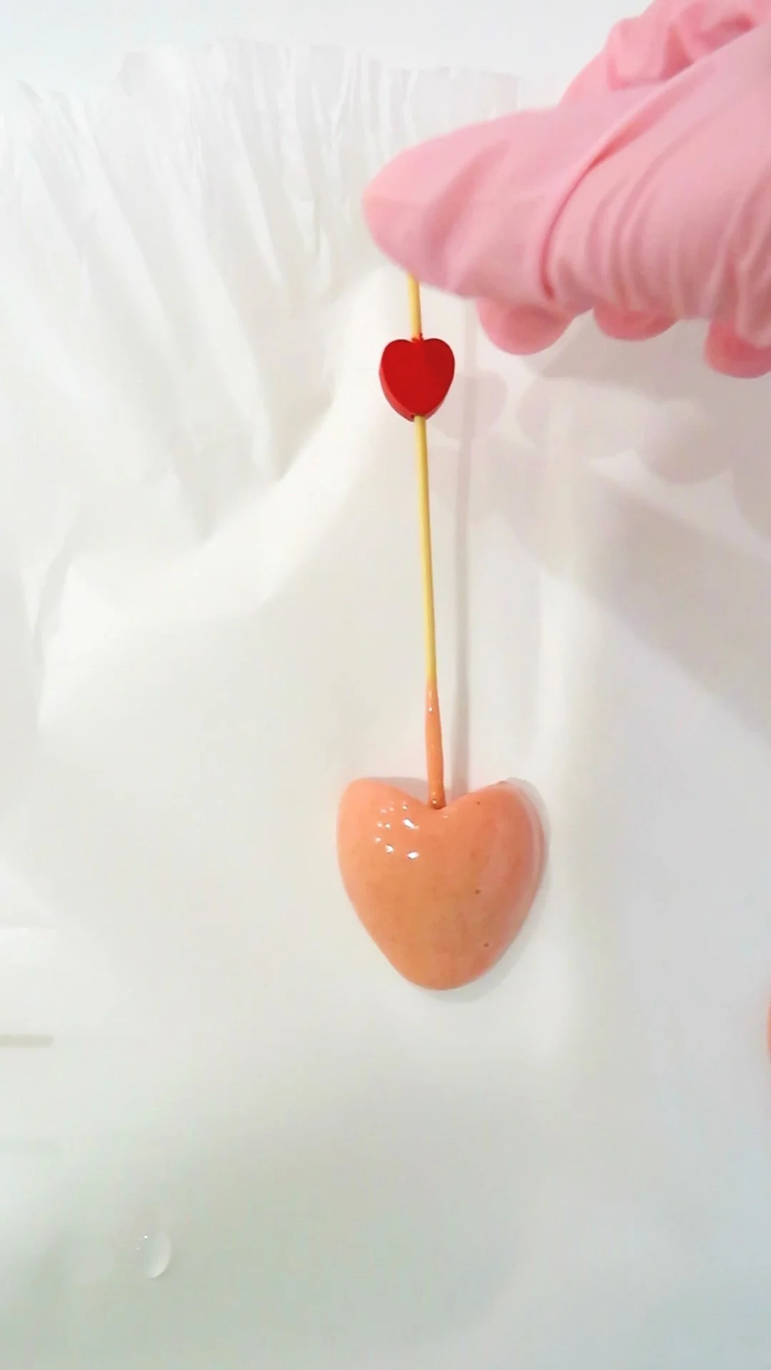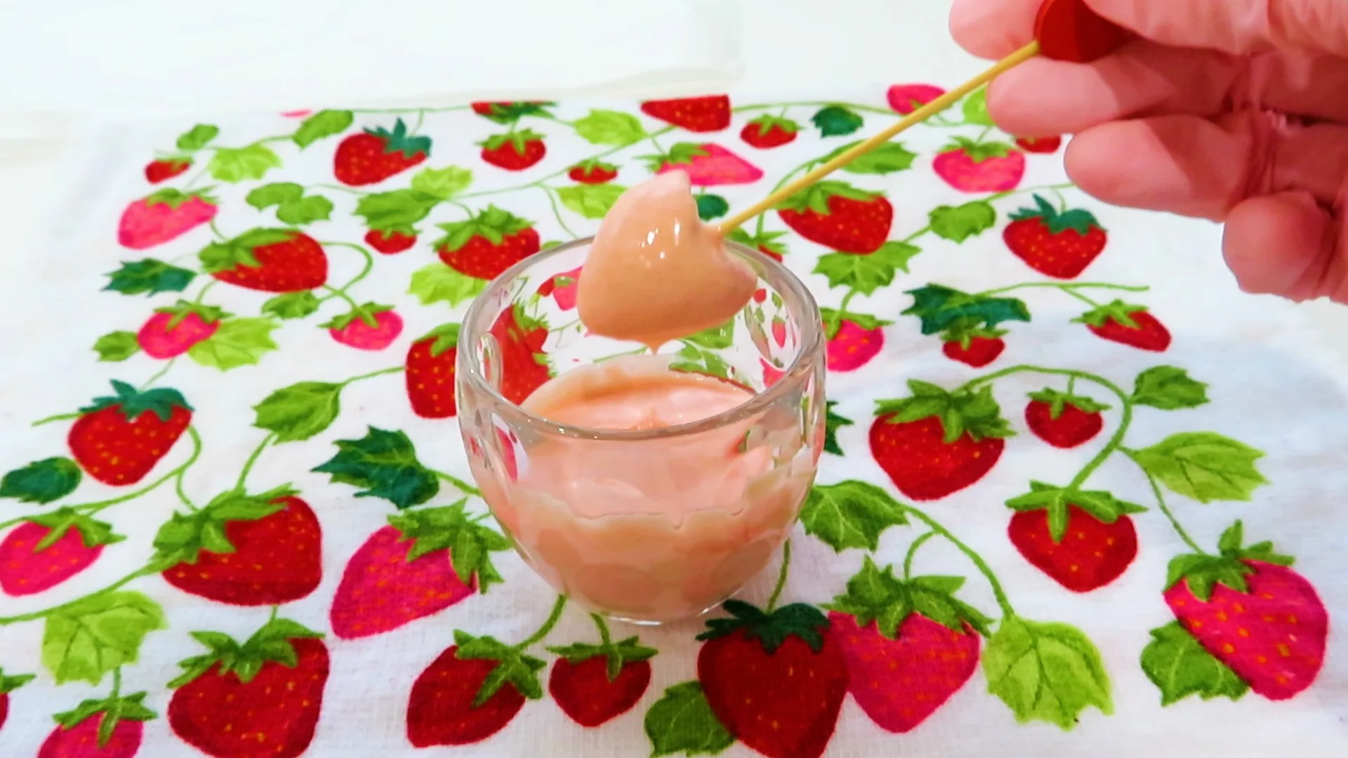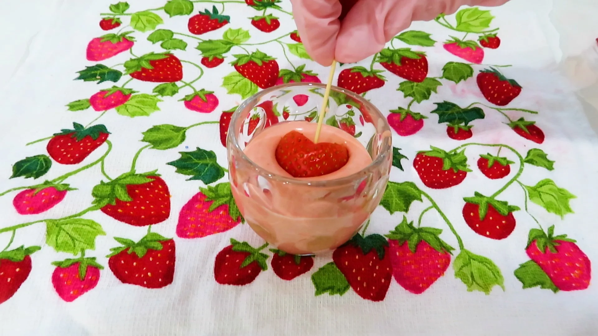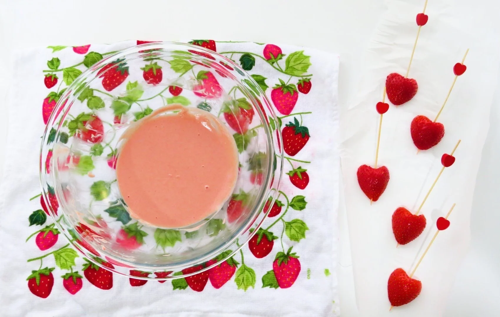 Turn off heat and transfer the melted pink chocolate to a tall, narrow vessel like a glass, which can allow you to dip the strawberries vertically into the chocolate.