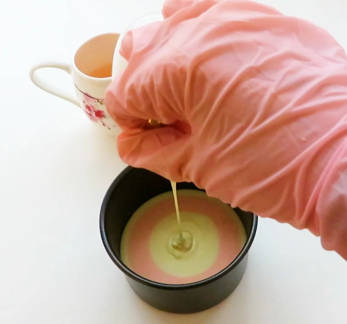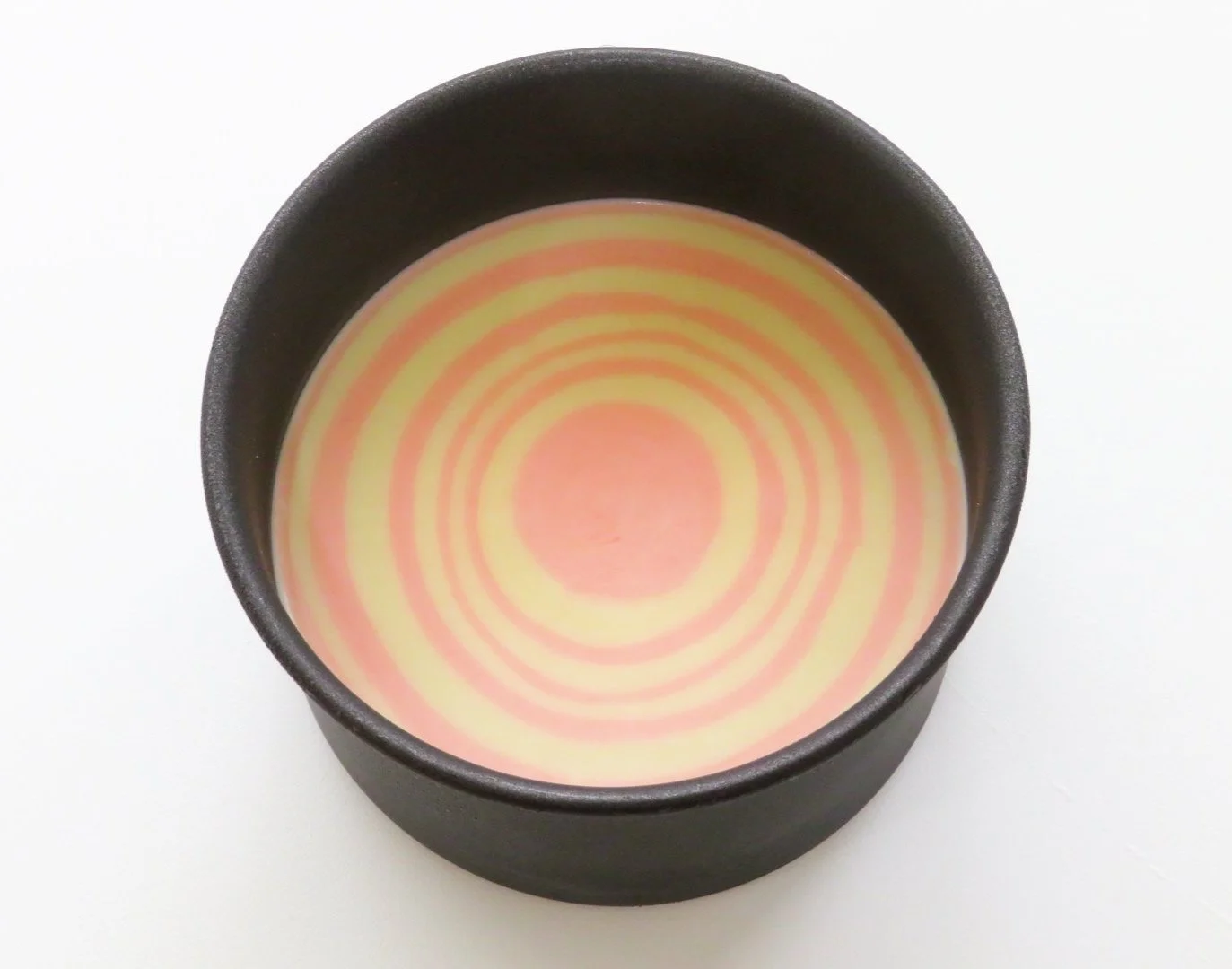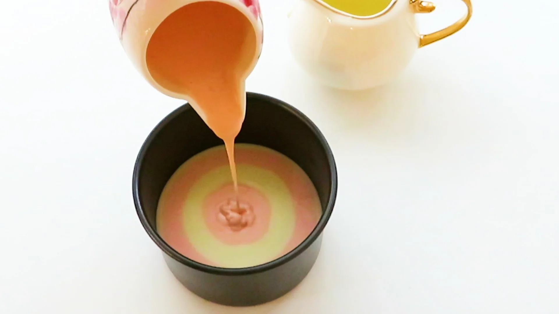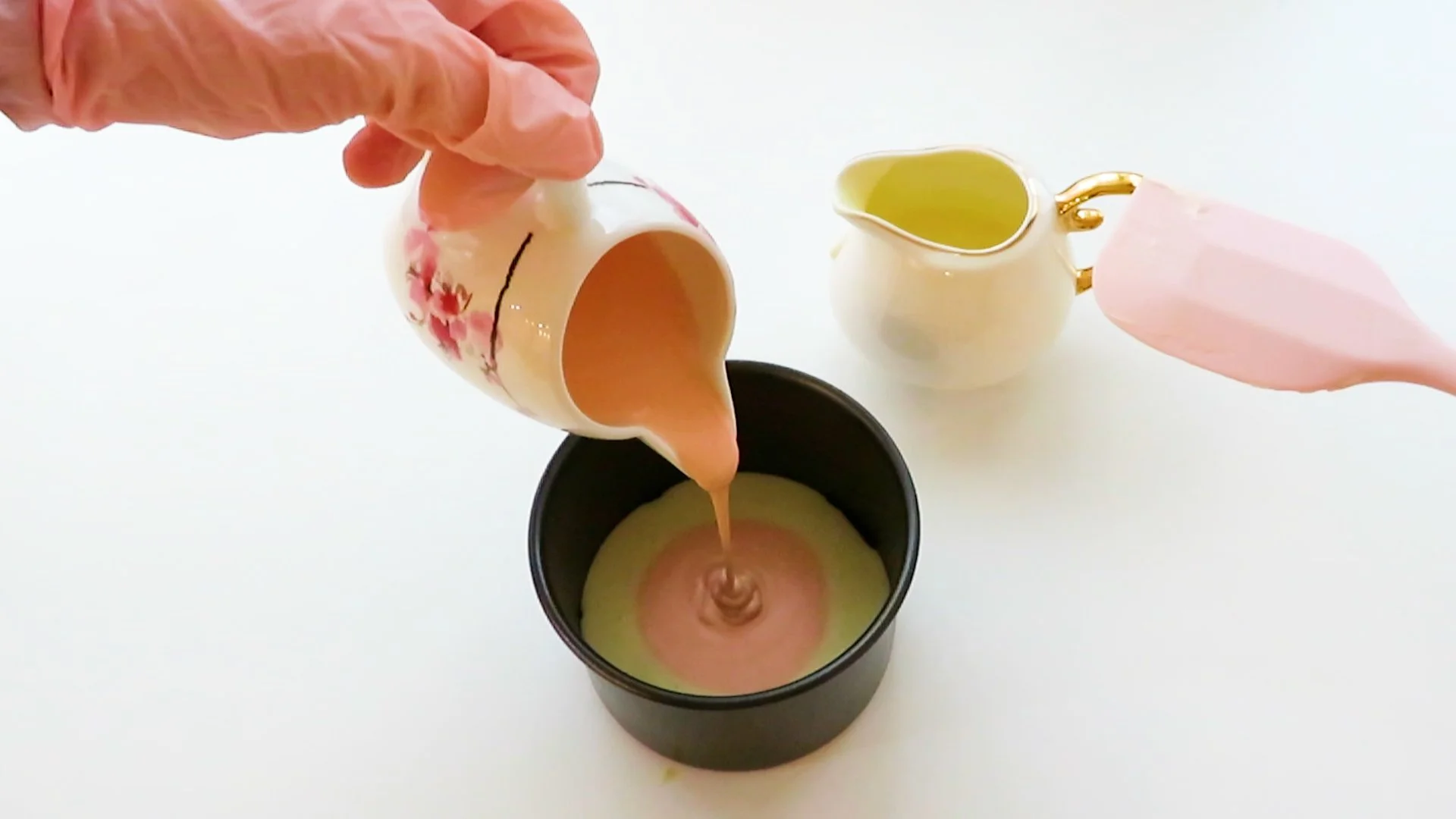 Transfer white and pink cheesecake fillings into two small pouring jugs/creamers. (It is useful to watch the video to understand the following pouring technique but I will explain it here too). Take the cake tin with the matcha Kitkat base and over the base pour in enough white cheesecake that it almost touches the edges of the cake tin. Then take the pink cheesecake and pour it in the centre over the white cheesecake - just pour directly in the centre and watch as a pink circle naturally emerges and spreads - you will notice that the pink cheesecake will sink into the white, creating a pink circle that will continue growing larger and spreading outwards. Allow it to spread until it leaves just a thick ring of white filling like a border - so it will look like a pink cheesecake with a white border. Then take your white cheesecake again and pour it into the centre of the pink, creating another spreading circle. You will notice that each new circle will push the previous circle outwards towards the edges of the cake tin and make a ring. Every time you add a new circle and the further you allow it to push outwards, the thinner the previous rings will become. If the outermost rings seem to disappear entirely as they are pushed outwards and replaced, don’t worry, that’s fine. These rings will join the pattern on the side and inside of the cheesecake which you will see when it is unmoulded.