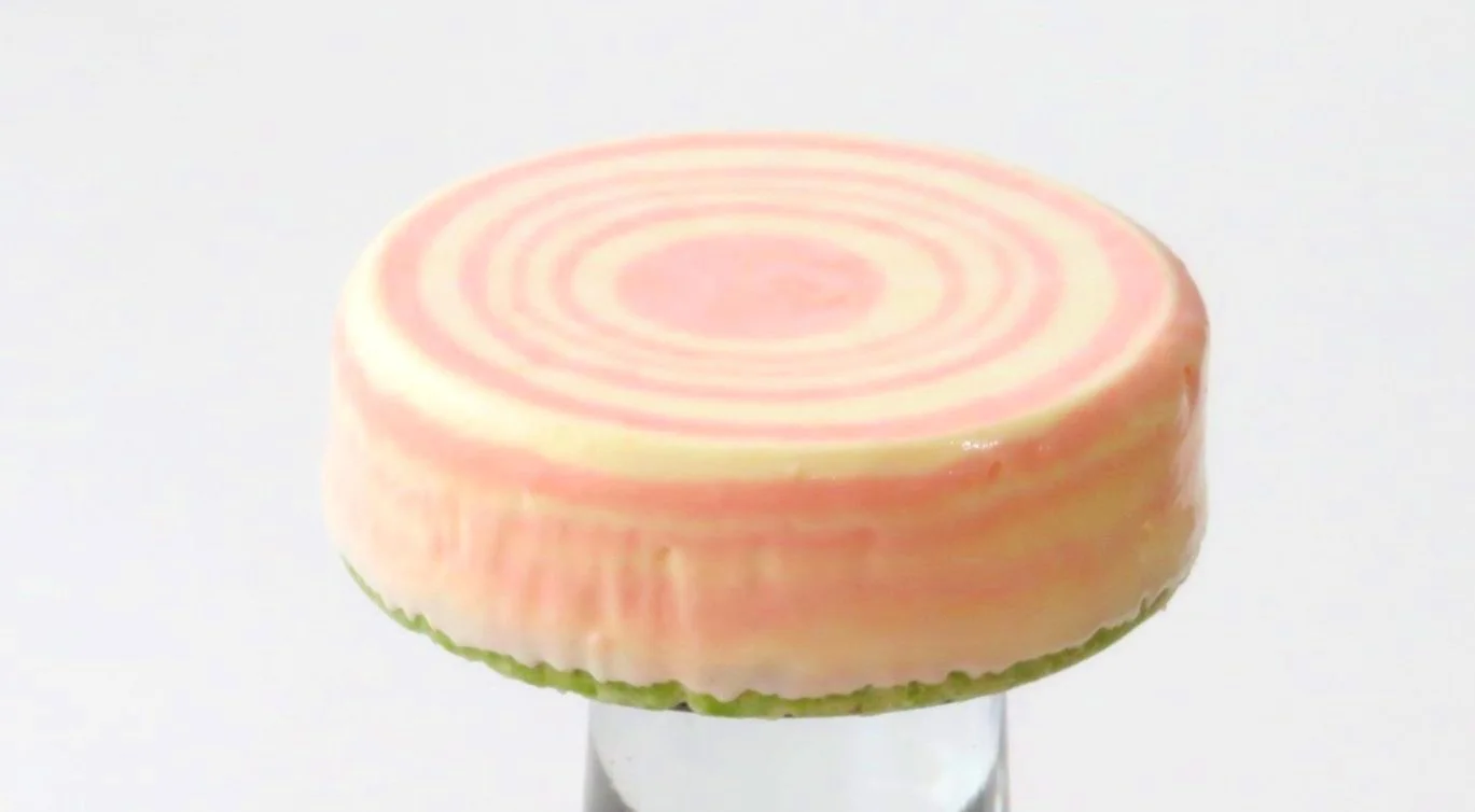 As you can see, the pattern appears as circles or rings on top of the cheesecake and stripes on the sides…but the pattern is also on the inside of the cheesecake too and looks amazing when sliced. And remember these aren’t just colours but flavours too! With the white being a vanilla cheesecake and the pink being a strawberry cheesecake - meaning you get an equal amount of vanilla and strawberry cheesecake flavour in each bite, paired with the Matcha Kitkat base!