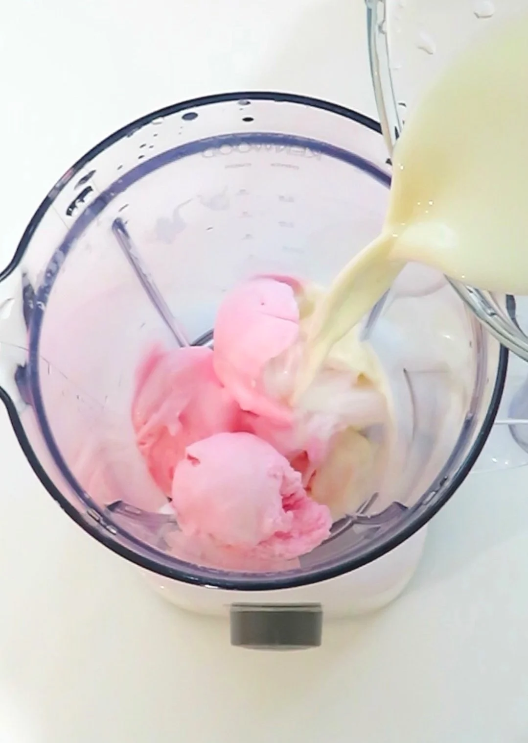 Add strawberry ice cream, milk and strawberry puree into a blender and blend on high speed until smooth and creamy in consistency. If too thin, add some more ice cream or if too thick add a little more milk and blend again to achieve the desired consistency.