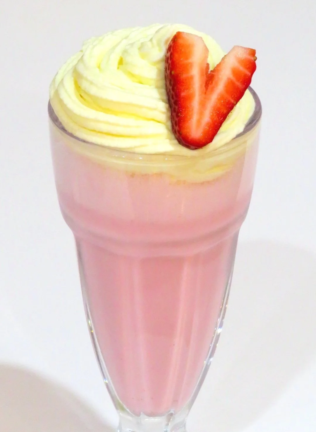 Pour milkshake into serving glasses and if you like, top with some whipped cream and half a fresh strawberry. Serve immediately and enjoy.
