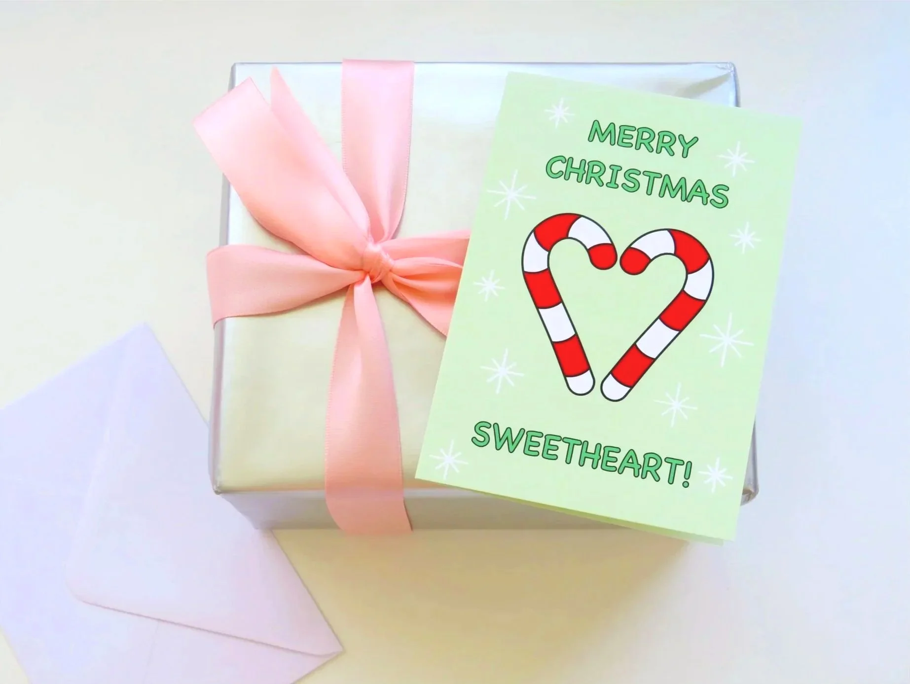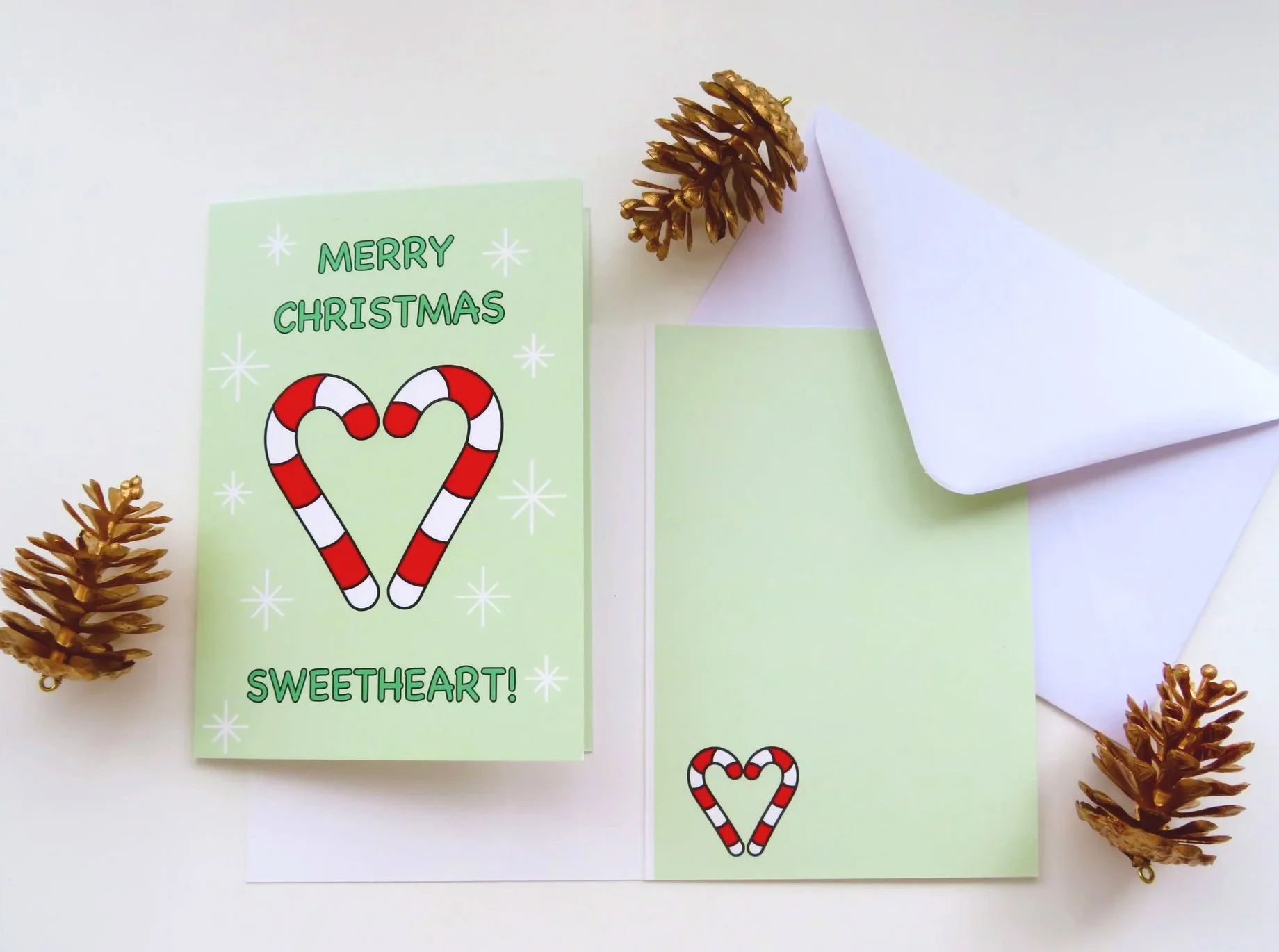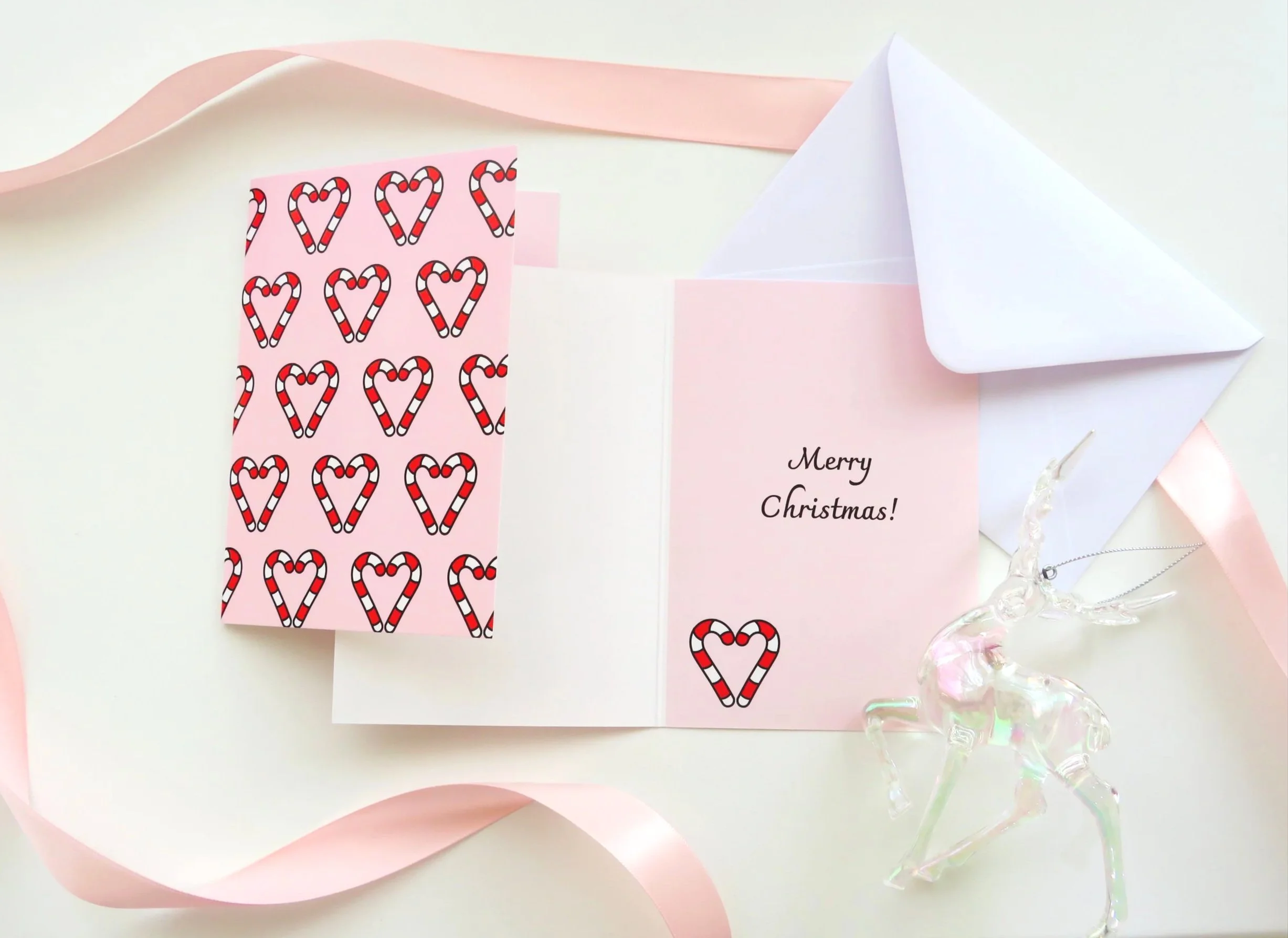 Give the gift of pure holiday elegance with this chic, candy-coated Christmas greeting card! Featuring a sophisticated, repeating pattern of candy cane hearts over a baby pink backdrop, this A6 card is the ultimate blend of girly charm and high-end design.